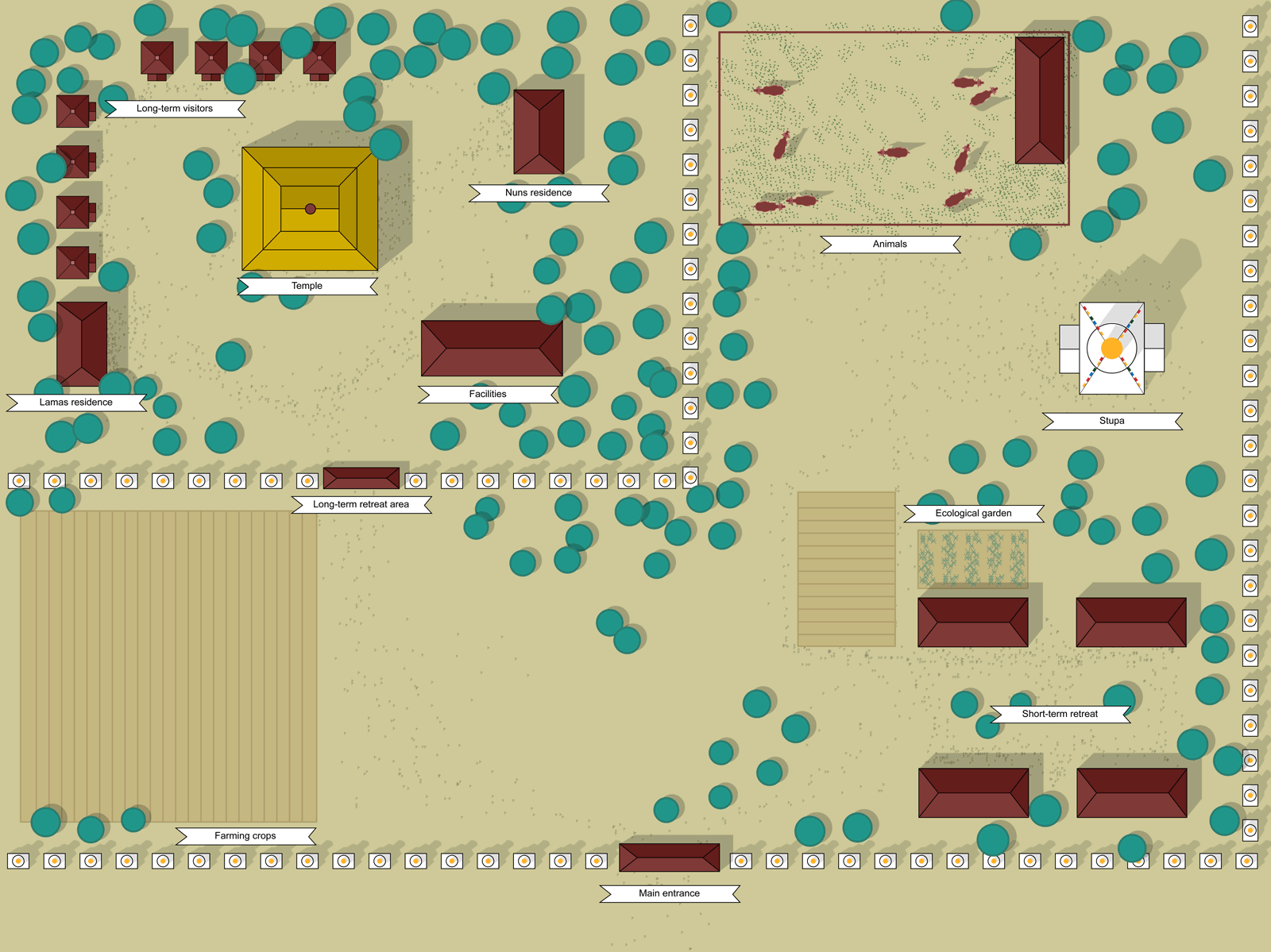 A temple will be constructed, where daily practice, teachings, and public lectures can be held. Small stupas will decorate the landscape. A large, central stupa will magnetize this sacred space.